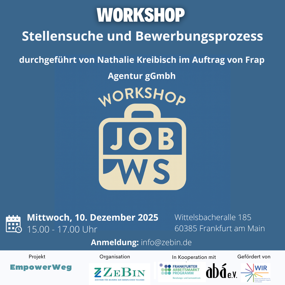 Die Veranstaltung ist Teil des Projekts EmpowerWeg und wird vom ZeBin e.V. organisiert. Sie erfolgt in Kooperation mit dem Frankfurter Arbeitsmarktprogramm und aba e. V., gefördert durch WIR.